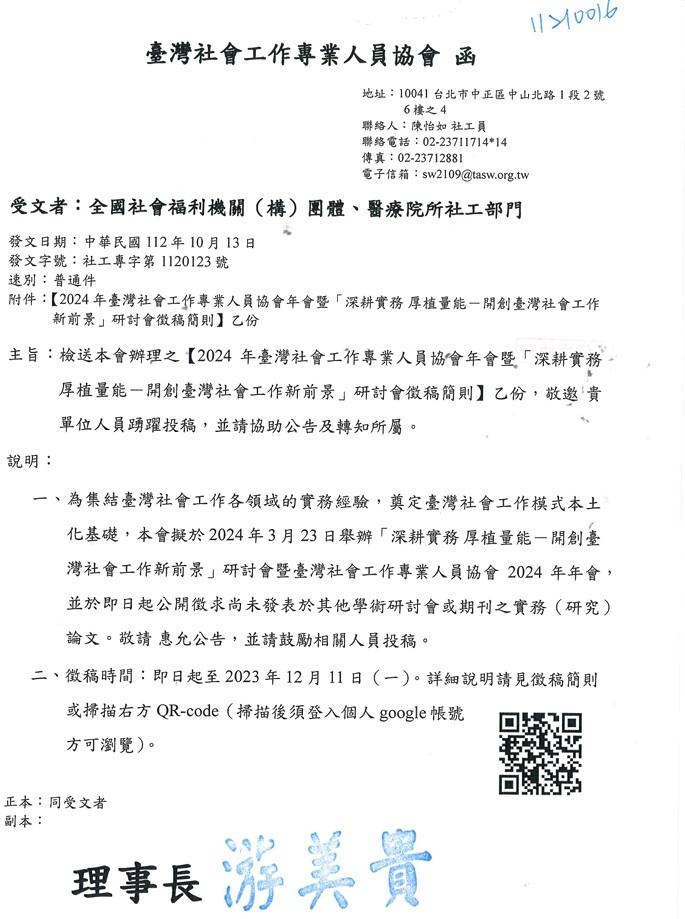 台灣社工專業協會2024年會徵稿即日起至2023年12月11日截止