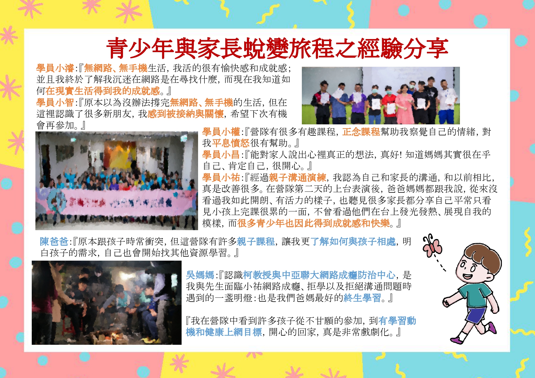 迄今已辦理19屆,協助參佰多位青少年走出迷網、找回自我的肯定、生命的熱情與目標!