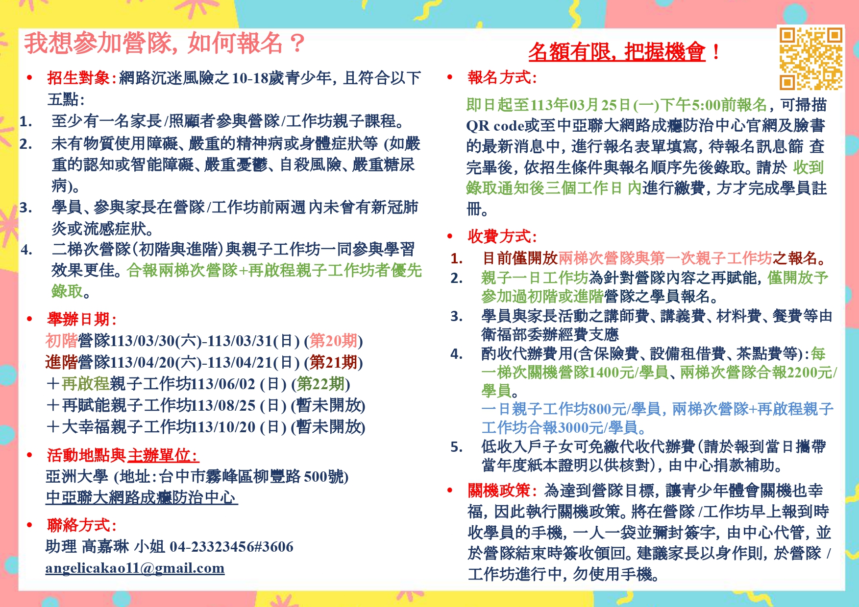 2.報名方式:可掃描QR code或至中亞聯大網路成癮防治中心官網及臉書的最新消息中,進行報名表單填寫,待報名訊息篩查完畢後,依招生條件與報名順序先後錄取。請於收到錄取通知後三個工作日內進行繳費,方才完成學員註冊。