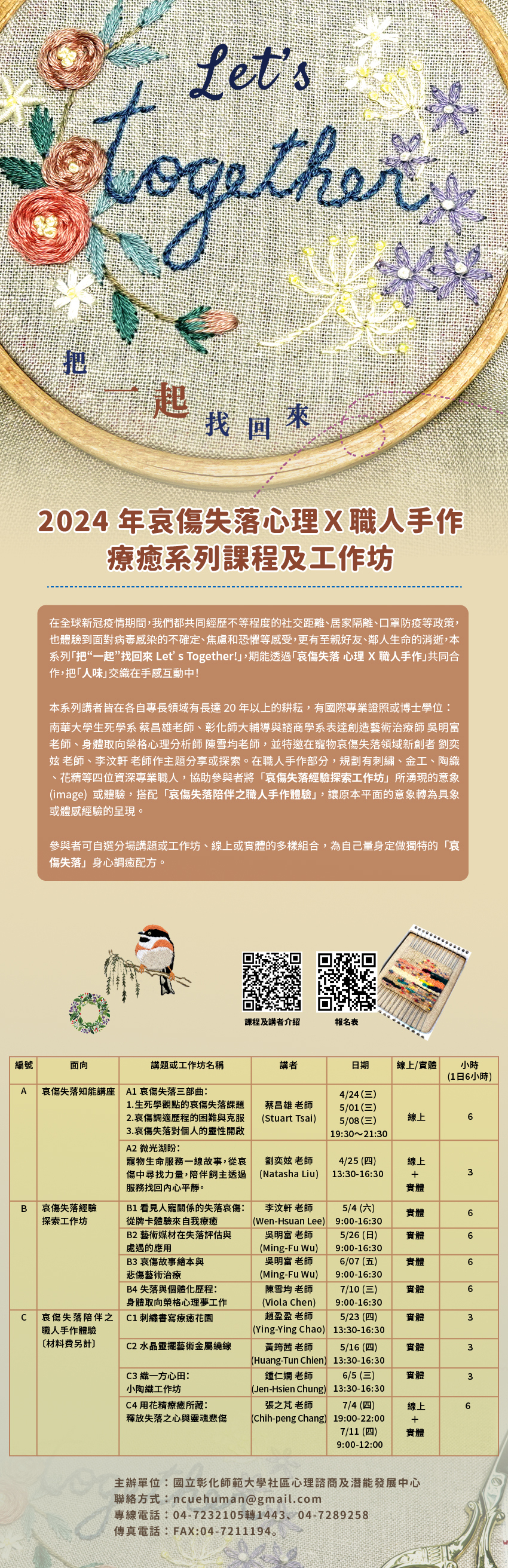 轉知國立彰化師範大學「113年度提升心理衛生專業人員實務訓練-哀傷失落心理x 職人手作系列講座與工作坊」
